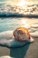 Zachte golven spelen rond de structuren van een betoverende schelp, de glinsterende strepen dansen in de avondzon. Het fijne schuim glanst als kleine diamanten op de zandbodem, terwijl de kalme golven een melancholische kustmelodie vertellen. Een vleugje zee en vakantie hangt in de lucht wanneer de natuur deze kostbare schoonheid omarmt.