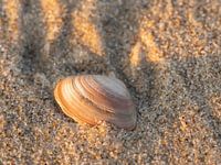 Schelp op het strand van Oost Groningen. Door het water worden mooie structuren in het zandstrand gemaakt. Het late avondlicht benadrukt dat met lange schaduwen.