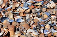 Beeldvullende opname van schelpen,gemaakt op het strand van Westkapelle, Zeeland Nederland. Deze schelpen waren met vloed aangespoeld en de laag was meters dik wat voor een kleurrijk beeld zorgt.