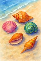 Koop dit schilderij Schelpen aquarelverf schilderij. van Johannes als reproductie op canvas, aluminium dibond, (ingelijste) fotoprint, behang en ArtFrame, op maat geprint in Fine-Art kwaliteit.