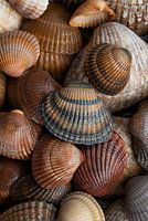 Schelpen bruin, beige en zandkleurig na een golf water van Marjolijn van den Berg