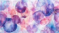 De schelpen zijn weergegeven in zachte pasteltinten van roze, paars en blauw, die overvloeien en samensmelten op een manier die zowel de vormen van de schelpen als de vloeiende aard van…
