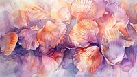 De schelpen zijn rijkelijk gedetailleerd en met een gevoel van diepte en textuur afgebeeld, waardoor elke schelp uniek en opvallend is. De kleuren variëren van zacht roze en paars tot diepe oranje en…