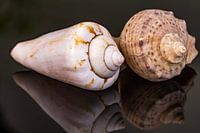 Prachtige schelpen, van dichtbij gefotografeerd (macro fotografie) op een zwarte glasplaat. De details van deze wonderbaarlijke creaturen uit de zee zijn prachtig om te zien.