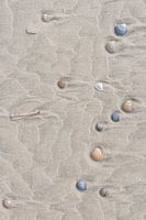 De lijnen in het zand van het teruggetrokken zeewater, geven samen met patroon van de schelpen een rustig beeld.…