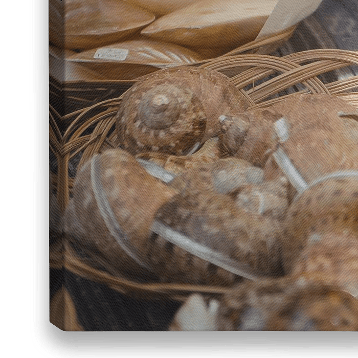 Verzameling mooie witte en bruine schelpen in mandjes, gesorteerd op soort en klaar om verkocht te worden. Deze schelpen zijn te vinden op de hippiemarkt bij Punta Arabi op Ibiza.