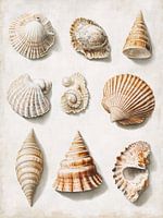 Een zachte, vintage-stijl collectie van verschillende schelpen op textuurachtige achtergrond. Elegant en rustig.