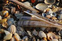 Close-up van schelpen op het Noord-Hollandse strand. De schelpen zijn aangespoeld op het strand bij Hargen.