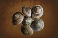 Stilleven van een paar kleine schelpjes in een mooie warme bruin-gouden tint.