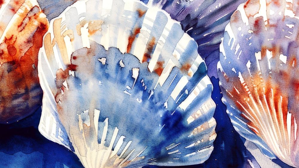 Dit rustgevende, trendy kunstwerk is een boeiende aquarel die een groep schelpen in een rijke en levendige compositie toont.