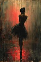 De achtergrond van het schilderij is abstract, met verticale en horizontale streken die zowel een gevoel van regen als van verval uitdrukken. De rode tinten lijken als een gloed achter de ballerina te hangen, misschien als een metafoor voor de passie en de energie die dansers uitstralen. De reflecties op de grond voegen diepte toe aan het stuk en suggereren dat de danseres zich op een nat oppervlak bevindt, wat bijdraagt aan de dromerige en etherische kwaliteit van het werk.