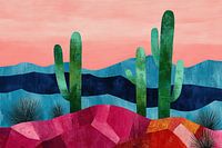 "Schemer in de Woestijn" vangt het kalme en vredige moment net voor het invallen van de nacht, waar het woestijnlandschap baadt in zachte roze en blauwe tinten. De torenhoge cactussen steken hoog af tegen de serene achtergrond van gelaagde bergen, wat zorgt voor een harmonieuze balans tussen de levendige voorgrond en de koele, verre…