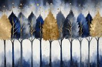 Een gestileerde bomenrij in saffierblauw, grijs en goud, die een vroege herfstochtend of late avond suggereert.