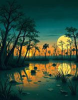 Deze afbeelding toont een sereen en gestileerd digitaal kunstwerk van een moeras- of waterlandschap in de schemering. De scène wordt gedomineerd door een grote, heldere volle maan die een warme, gele gloed over de hemel werpt, die overgaat van diep groenblauw aan de bovenkant naar vurig oranje aan de horizon. Silhouetten van bomen met…