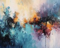 Schemering Kleurenspel | Abstracte Horizon - Dit dynamische abstracte schilderij combineert koel blauw met warme oranje en roodtinten, waarbij een levendige horizon van kleur tot expressie komt. De ongestructureerde, brede penseelstreken en de textuur scheppen een boeiend spel van licht en schaduw, perfect voor een hedendaags interieur dat wel wat kleur kan gebruiken.