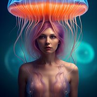 Het kunstwerk toont een fascinerende en dromerige onderwaterwereld, waarin een elegante vrouw wordt vergezeld door een sierlijke kwal die sierlijk boven haar hoofd zweeft. De vrouw en de kwal lijken één te zijn met hun omgeving, zwevend in een betoverende zee van wonderen.