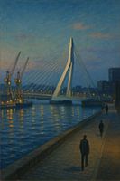 Dit kunstwerk verkent Rotterdam als een stad van heruitvinding - strak, veerkrachtig en reflecterend. De schilder vangt die spanning tussen innovatie en introspectie: de harde geometrie van de brug verzacht door het melancholische licht van de avond. Het palet is ingetogen - blauw, grijs en een vleugje oker - waardoor een harmonie ontstaat die zowel modern als tijdloos aanvoelt.