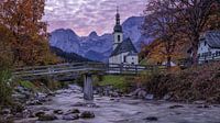 Op de voorgrond steekt een rustieke houten brug over de snelstromende Ramsauer Ache (rivier), die de blik naar de iconische kerk leidt. De rivier stroomt over de rotsen, vastgelegd met een lichte lange sluitertijd, wat een zacht en vloeiend effect geeft. De majestueuze bergen op de achtergrond zijn gehuld in een koele, blauw-paarse tint en contrasteren prachtig met de warme herfstkleuren van de bomen aan weerszijden.