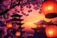Het tafereel schittert in zachte tinten paars en roze, waar tere kersenbloesems en verlichte lantaarns elkaar ontmoeten. De majestueuze pagodes omlijsten een betoverende zonsondergang en stralen rust uit. Deze harmonieuze compositie brengt oosterse flair en elegantie naar een woonkamer die gezelligheid en dromerige avonden belooft.