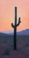 'Schemering in de Woestijn' is een kunstwerk dat de verstilde schoonheid van de woestijn vastlegt tijdens het vallen van de avond. Een solitaire cactus steekt af tegen de zachte, warme kleuren van de hemel, terwijl de contouren van de bergen op de achtergrond vervagen in de schemer. Dit minimalistische beeld straalt een gevoel van rust…