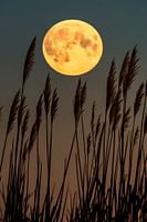 Hoge grassen verheffen zich in zachte silhouetten tegen de stralende, gouden maan die de nachtelijke hemel majestueus verlicht. Zijn warme licht verleent het tafereel een magische gloed, terwijl de hemel glinstert in diepe blauwe en grijze tinten. Een verstild moment waarin natuur en hemellichamen in perfecte harmonie samensmelten.