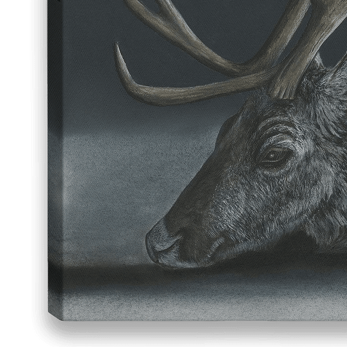 De aquarel toont een rustend rendier, dat in zijn soberheid gemaakt is voor de wilde, arctische natuur.