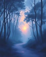 Deze afbeelding toont een serene en etherische bosscène bij schemering of dageraad. De overheersende kleuren zijn koel blauw en grijs, wat een rustige en licht melancholische sfeer creëert. Silhouetten van bomen omzomen een mistig pad of waterlichaam dat naar een zacht gloeiende horizon leidt. De subtiele roze en oranje tinten van de opkomende of ondergaande zon gluren door de takken en zorgen voor een zacht contrast en focuspunt. De algehele compositie roept een gevoel op van vrede, mysterie en de stille schoonheid van natuur's overgangen. De schilderachtige stijl en zachte texturen dragen bij aan de dromerige kwaliteit van het beeld.