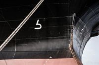 Een boeg van een schip. Sporen van roest een lichtbewolkte lucht. Het ijkmerk op de bulb en de trossen naar de kade. Het profiel van de lassen van de huidplaten.