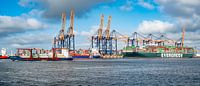 Schepen bij de Euromax containerterminal in de haven van Rotterdam, Nederland. Brede panoramafoto van de schepen die aan de terminal liggen en een schip dat op de voorgrond voorbij vaart. Het grootste schip is het containerschip Ever Golden van rederij Evergreen Line. De Ever Golden is een schip van de Evergreen G-klasse, gebouwd naar het Imabari-containerschipontwerp van 20000 TEU.