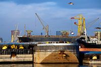 Schepen en overslag in de haven van Rotterdam terwijl 2 eenden voorbij vliegen