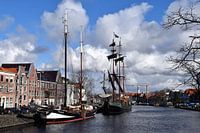 Twee schepen liggen in het historische centrum van Haarlem in de rivier het Spaarne. Een Hollandse wolkenlucht geeft een speciaal effect aan het beeld.