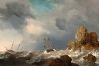 Ships in a Gale is een van de vroege meesterwerken van Van de Velde. Het is gevuld met het drama van een kolkende zee waarop twee door stormweerkaatsende schepen worstelen om gekartelde rotsen te ontwijken die al een derde schip hebben opgeëist. Het schilderij is niet alleen compositorisch dramatisch, maar ook eindeloos in de details: figuren klauteren masten op, trekken de zeilen aan en hangen aan lijnen die aan de boegspriet vastzitten. Terwijl de vogels over de schuimende brekers heen ploeteren, vechten de zeelui tegen de golven in hun wanhopige poging om de relatieve veiligheid van de rotsen te bereiken voordat ze verdrinken. Het schilderij is in buitengewone staat en heeft elk element van zijn oorspronkelijke karakter behouden, met name in de lichamelijkheid van de schepen, de figuren en de rotsen en de doorschijnendheid van de wolken, de lucht en het water.