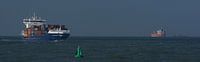 Een panorama van de schepen die naar Rotterdam komen en ook de haven verlaten. Schepen op de horizon geladen of onderweg naar de volgende haven.