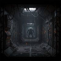 Donkere, afgesloten gang met een mensachtig wezen aan het einde. De muren zijn bedekt met draden en elektronische panelen.