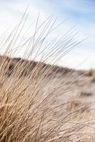 In de voorgrond van deze foto, vrijwel over de hele foto, is helmgras te zien, dat scherp is gefotografeerd. Het is beige, en zachtgeel.
