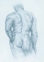 Schets , potlood tekening van een man. Naakt staande met zijn linker hand op zijn heup. Zijn rechter hand rust op zijn rechter bovenbeen. We zien de man zijn rug, billen, schouders, nek en armen. De hand welke op zijn heup ligt geeft deze pose een prachtig dynamisch beeld. Zijn linker heup en bil staan hoger , waardoor de rondingen van zijn lichaam hier mooi over elkaar heen vallen. Zijn elleboog die naar ons toe wijst springt in het oog. Door het spel van licht en donker wordt deze schets bijna tastbaar.