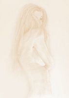 Potlood tekening van een jonge vrouw, gezien van haar zij. Ze poseert naakt terwijl haar arm haar borst bedekt. Ze heeft lang vol stijl haar dat mooi over haar schouders valt. Dromerig kijkt ze schuin omlaag, waarbij we een gedeelte van haar gezicht achter haar lange lokken zien. Haar lichaam zien we tot aan haar middel, schouder lichtjes opgetrokken waardoor ze een onschuldige romantische uitstraling krijgt.