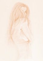 Potlood tekening van een jonge vrouw, gezien van haar zij. Ze poseert naakt terwijl haar arm haar borst bedekt. Ze heeft lang vol stijl haar dat mooi over haar schouders valt. Dromerig kijkt ze schuin omlaag, waarbij we een gedeelte van haar gezicht achter haar lange lokken zien. Haar lichaam zien we tot aan haar middel, schouder lichtjes opgetrokken waardoor ze een onschuldige romantische uitstraling krijgt.