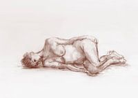 Schets van een liggende naakte vrouw. Haar hoofd ligt op de grond en haar knieën zijn opgetrokken . We zien hoe de rondingen van haar borsten en buik zich aanpassen aan de zwaartekracht, en haar lichaam plat de vloer raakt. Haar linkerarm rust op haar heup terwijl haar rechter arm langs haar lichaam ligt.