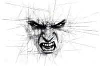 Zwart-wit schets van het gezicht van een man met sterke emoties zoals woede en frustratie. Dynamische grafische lijnen geven de compositie extra intensiteit en expressiviteit.