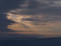 Silhouet van het historische kasteel Hohenzollern tussen de donkere heuvels van de Zwabische Alb met oranje bewolkte hemel in de winter.