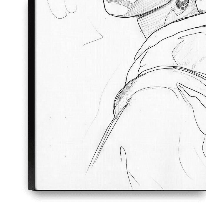 Deze beklemmende schets van het Meisje met de parel geeft de essentie van Vermeers werk weer met gedurfde eenvoud. Het monochrome palet benadrukt de rauwe schoonheid van het meisje, terwijl de contrasterende stijl haar delicate gelaatstrekken benadrukt. De streken en arceringen spelen op het papier alsof ze het ontroerende verhaal van…