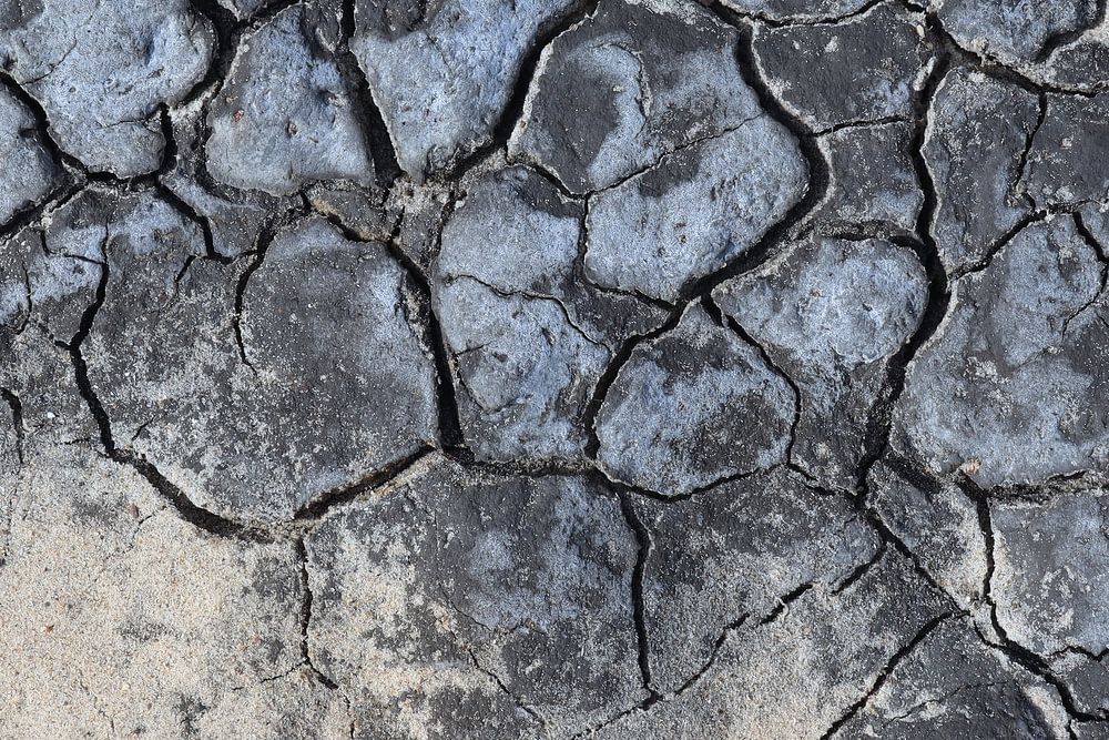 Abstracte scheuren in de grond op een zandstrand aan de Opaalkust in Noord-Frankrijk. Prachtig natuurlijk patroon met zachte blauwe, grijze en beige tinten.