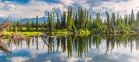 Leunende bomen bij een klein meer, Denali Highway, Alaska, USA