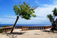 Foto van een scheefgegroeide boom aan de Spaanse kust