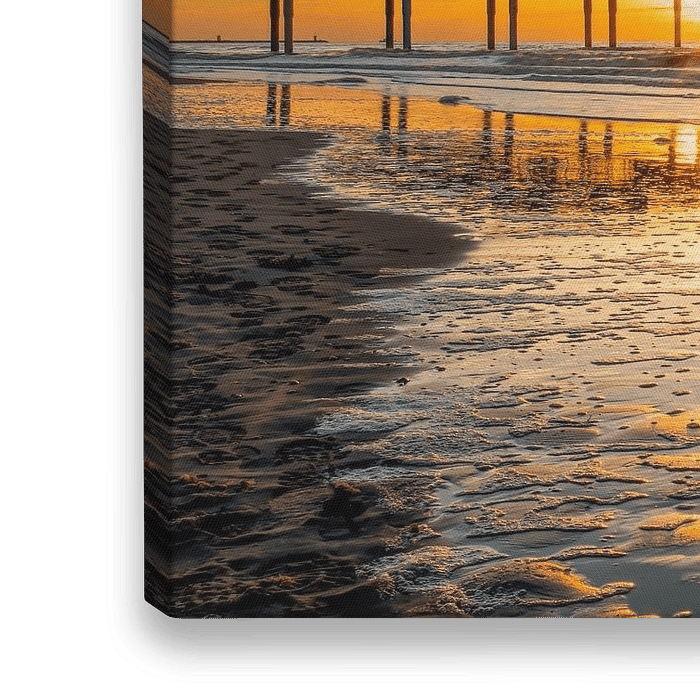 De zon zakt net onder de pier en de lucht kleurt mooi oranje. De pier en het reuzenrad weerspiegelen in het water