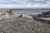 Een stelletje wandelt op deze mooie morgen naar het baken op het zuidelijke havenhoofd. Verder zijn er nog slechts weinig mensen op de been.