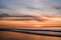 Landschap op het strand van Scheveningen, Zuid-Holland, met zicht op de noordzee tijdens zonsondergang. Hier is gebruik gemaakt van meervoudige belichting. Twee foto's werden samengevoegd in de camera, waarvan één foto normaal scherp is, en de andere is een ICM, ofwel intentional camera movement, wat het geheel zacht en een beetje…