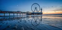 De pier van Scheveningen op een mooie zomerse avond. Door een laag standpunt te kiezen worden de reflecties mooi weergegeven in het water en komt het reliëf van het zand goed tot zijn recht
