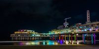 Kleurrijke avondopname van de pier van Scheveningen. Vanwege de lange opname tijd zijn de golven veranderd in een fluweelzachte deken waar het aanwezige gekleurde licht mooi in reflecteert.